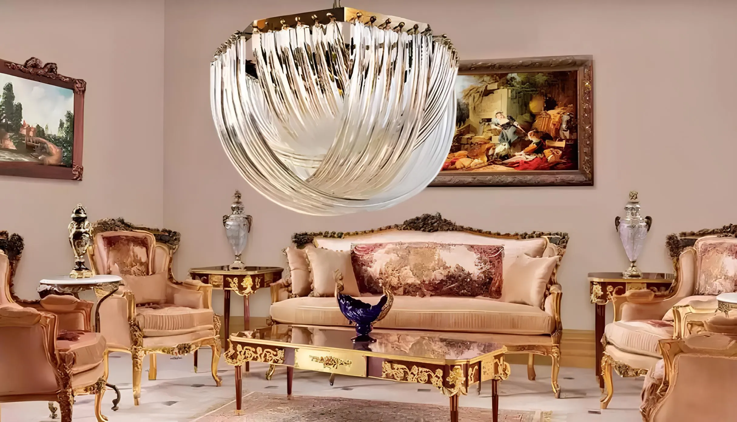 - Wohnzimmer: Ein großer Kristallkronleuchter über dem Couchtisch wird zum Blickfang und sorgt für eine festliche Atmosphäre.
